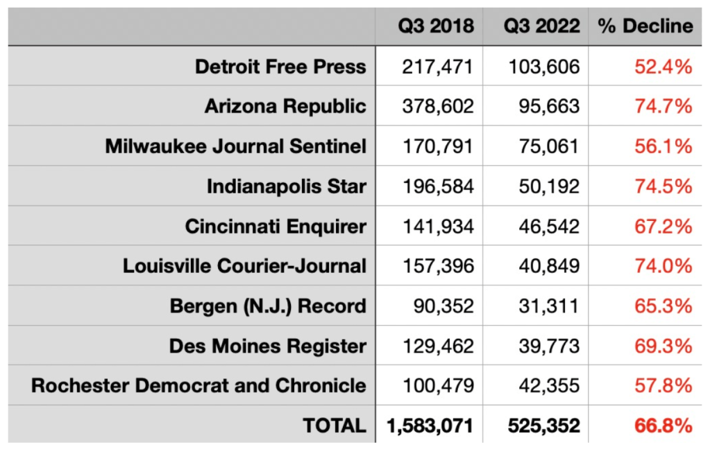 Brief backstory: I’ve paid for home delivery of the printed paper since returning to The Valley four years ago. The Republic, battered as much if not more than any other daily in the nation (see print circulation chart below), still produces some fantastic work by talented journalists. Is it a shell of its former self? Of course. Have I had complaints? Many. Enough to cancel? No. Local journalism is too important.